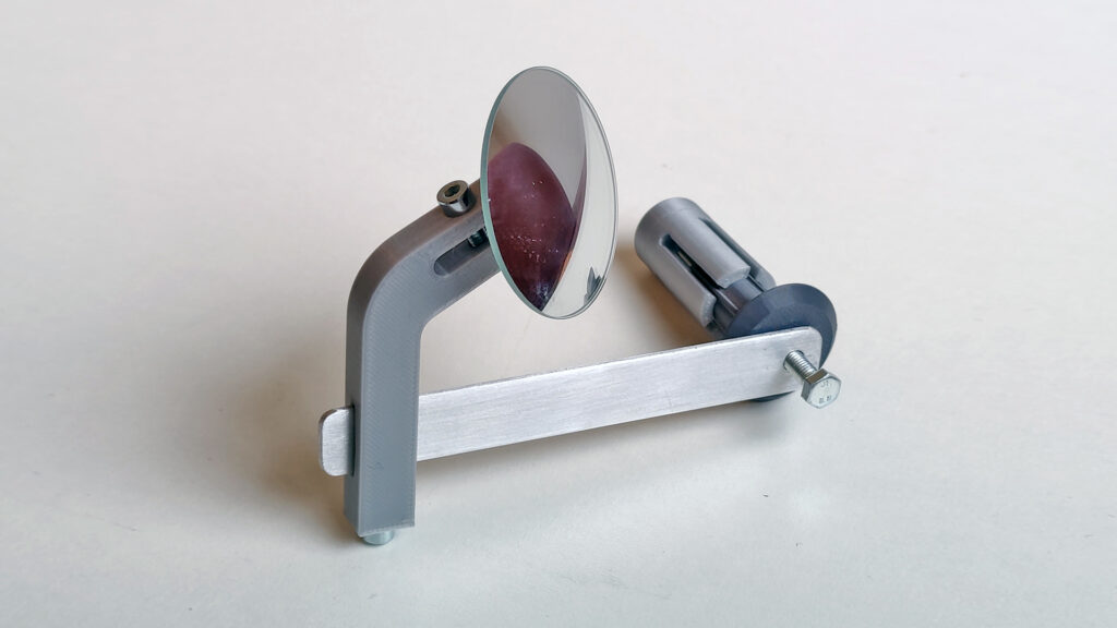 Een klein onopvallend spiegeltje dat aan het uiteinde van het stuur wordt bevestigd. Het kan op veel manieren worden versteld en trilt niet tijdens het rijden op hobbelige wegen.